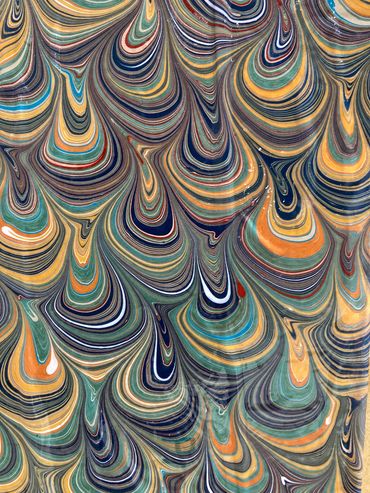 A few years ago I started to take paper marbling seriously. It had always been something I enjoyed doing, but during a difficult time in my life I found that the process of water marbling relaxed my mind and helped me de-stress. I soon ended up with lots of sheets of beautiful marbled paper, so I decided to use them in my bookbinding - now it's become part of my brand.